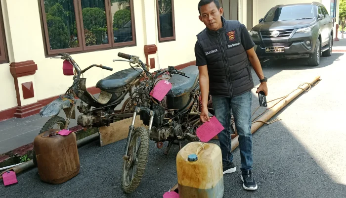 Dari tangan pelaku, berhasil diamankan satu unit sepeda motor tanpa nomor Polisi, tanpa bodi dan ban belakang, satu gulung tali tambang, sebatang besi canting serta satu galo berwarna yang di dalamnya berisi cairan minyak mentah yang disinyalir sebagai alat menambang minyak.