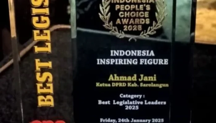 Ketua DPRD Kabupaten Sarolangun, Ahmad Jani, menerima penghargaan Indonesia People’s Choice Awards 2025 kategori best legislative berupa plakat dan sertifikat yang diserahkan langsung Ketua Tim Panelis dari The One Magazine Safitri Wardana, M.Hum.
