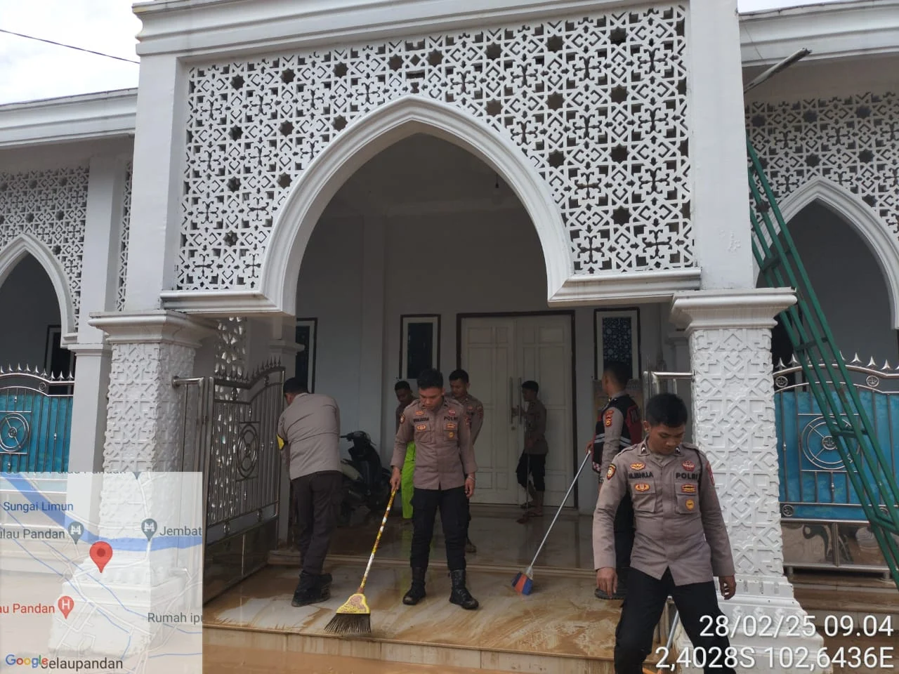 Paska Banjir Personel Sat Samapta Polres Sarolangun Bantu Bersihkan Lumpur di Masjid Desa Pulau Pandan Usai Banjir