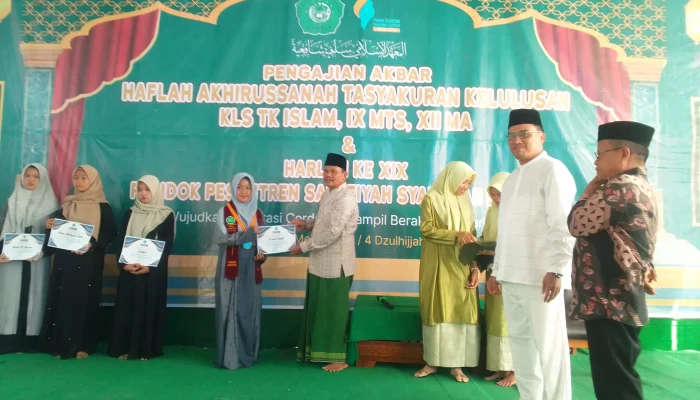SAROLANGUN -Lurah Sei Benteng Kecamatan Singkut Pikri,S.PdI saat menghadiri Pengajian Akbar Haflah Akhirussanah Tasyakuran Kelulusan kelas TK Islam ,IX MTS ,XII MA @ Harlah ke XIX Ponpes Salafiyah Syafi” iyah ,Sabtu 31 Mei 2025 .