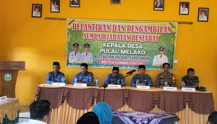 SAROLANGUN – Untuk mengisi kekosongan jabatan Kepala Desa Pulau Melako, Camat Bathin VIII Ario L.Fajrin, S.IP., MH, pada Kamis (17/07/2025) bertempat diaula Kecamatan Bathin III. melantik Kholid, A.MK sebagai Pejabat (Pj) Kades Pulau Melako.