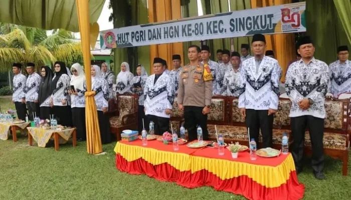 Dalam rangka menyambut Hari Ulang Tahun ke-80 Persatuan Guru Republik Indonesia (PGRI) dan Hari Guru Nasional (HGN) Tahun 2025, Pengurus Cabang PGRI Kecamatan Singkut melaksanakan Upacara Bendera di Lapangan SDN 60/VII Payo Lebar Kecamatan Singkut Selasa (25/11/2025).