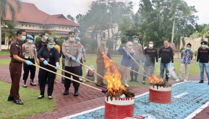 Setelah melakukan release, Kapolres Sarolangun bersama Ketua Pengadilan Negeri Sarolangun, Novarina Manurung, S.H., Kajari diwakili Kasi Pidum Susilo, SH.MH, Kasat Narkoba Polres Sarolangun AKP Ojak P. Sitanggang, Lurah Aur Gading diwakili Ali Wardana, dan Dinas Kesehatan Sarolangun memusnahkan Narkotika jenis ganja tersebut dengan cara dibakar di halaman Mapolres Sarolangun. (Ang)